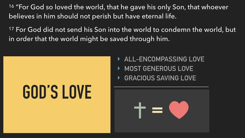 16 For God so loved the world that he gave his one and only Son that whoever believes in him shall not perish but have eternal life.